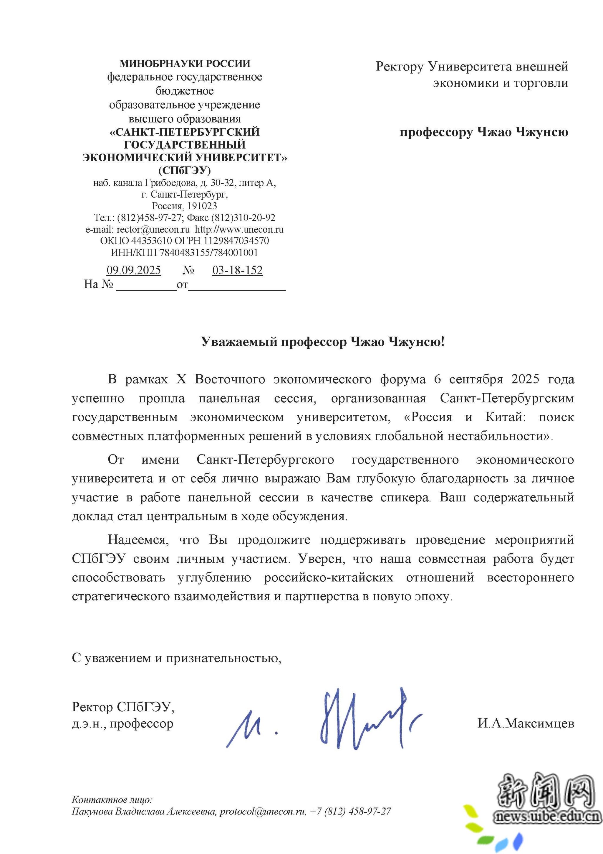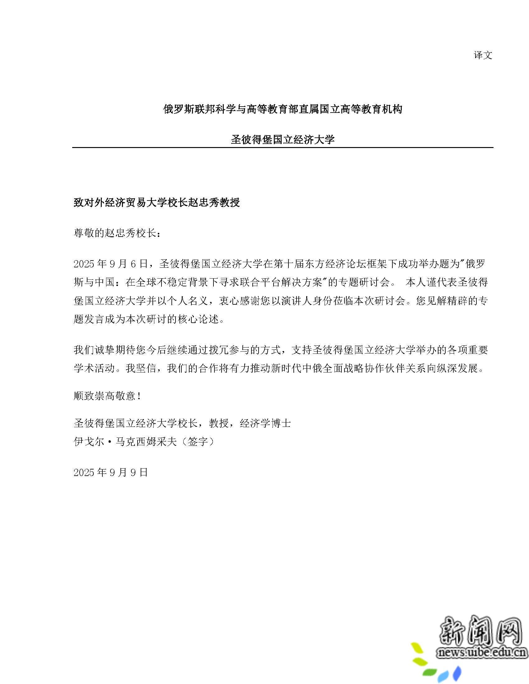 校新闻网讯(区域国别研究院供稿)9月9日,俄罗斯圣彼得堡国立经济大学校长伊戈尔·马克西姆采夫致函我校校长赵忠秀,感谢其出席第十届东方经济论坛下的“俄罗斯与中国:在全球不稳定背景下寻求联合平台解决方案”专题研讨会并做专题发言。来函对赵忠秀的精彩发言给予高度评价,并期待双边深化合作,协同推动新时代中俄全面战略协作伙伴关系向纵深发展。