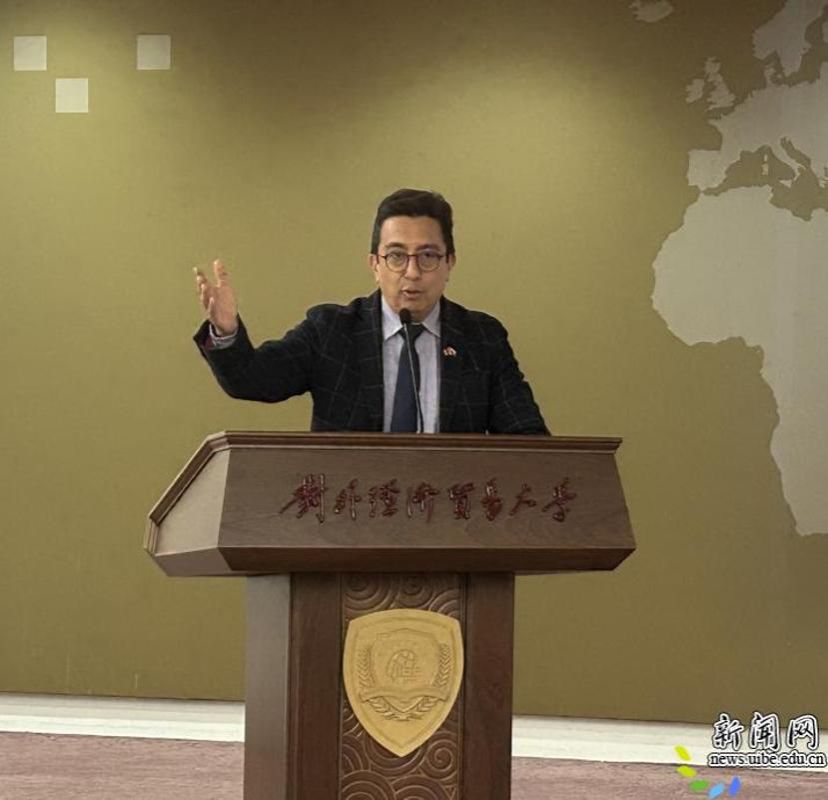 随后的讲座中,Cristian Mancheno公使以“安第斯山脉中的丝绸之路遗址:对‘一带一路’和中拉合作的地缘政治分析”为题,介绍了厄瓜多尔与中国在“一带一路”倡议下开展的密切合作。Cristian Mancheno公使详细介绍了厄瓜多尔的区位优势和特产资源,指出近年来随着中拉高质量共建“一带一路”深入推进,中拉“跨半球”往来更加便利,越来越多的厄瓜多尔和拉美产品进入中国市场,希望两国能够继续深化当前在农产品贸易、基础设施、金融等领域的合作。Cristian Mancheno公使强调,“一带一路”倡议秉持共商共建共享的原则,带动了共建国家的经济发展与建设,取得了卓越的成果,希望未来中厄两国能够更加深化在“一带一路”框架下的合作,丰富合作内容和扩展合作领域,共创更多的丰硕成果和骄人成绩。