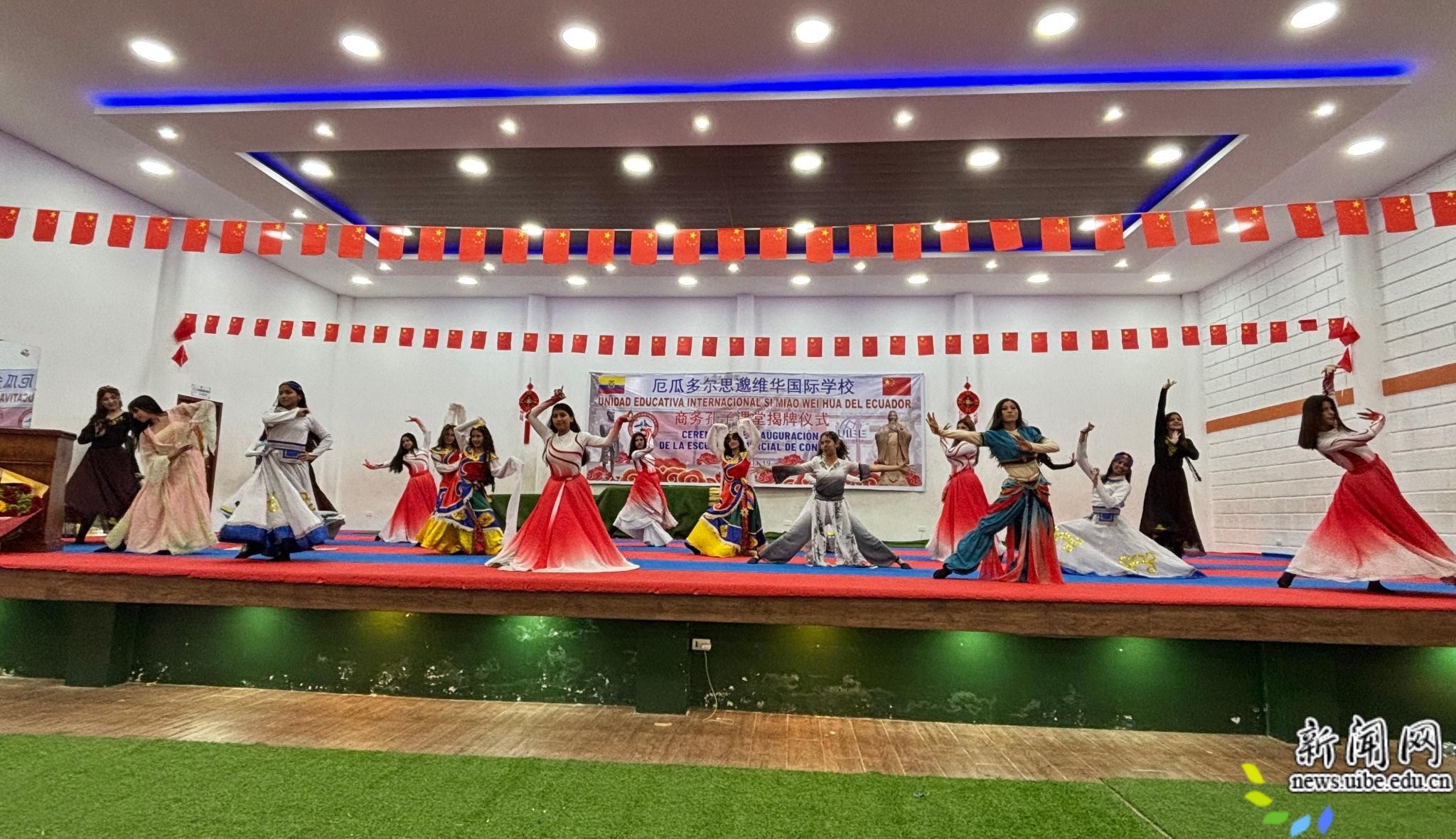 校新闻网讯(国际中文教育(商务)实践与研究基地供稿)1月19日,厄瓜多尔思邈维华国际学校与我校共建的商务孔子课堂揭牌暨和合共生园奠基仪式隆重举行。中国驻厄瓜多尔大使孙向阳、厄方政要及兄弟孔院代表等嘉宾出席活动。该校文艺团体“车轮上的中国文化宣传队”在仪式上进行表演,展现中厄文化交流成果。