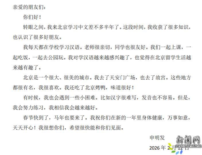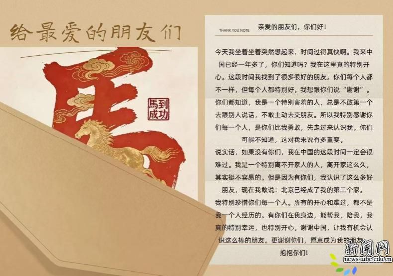活动的第一篇章是一封封跨越山海的家书。高班的哈米特写下对班主任老师的感激:“这六个月学到的东西,比过去整整一年还要多。”字里行间,是语言进步的欣喜。同班的吉瑶娜则用一张精心制作的贺卡向朋友们袒露心迹:“北京已经成了我的第二个家。”那些初到中国时的忐忑都被同学间的温情化解。理工班的申明发用朴素的笔触,记录下自己在北京的点点滴滴,信末那句“我相信我会越来越好”,是对远方的亲人最温柔的安慰。一封封真挚的书信,承载着留学生对中国师友的感恩,也传递着跨越国界的温情。