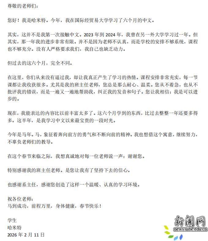 这场春节系列活动,不只是节日的点缀,更是一场深情的集体表达。一封封书信跨越山海传递真情,一面面心愿墙凝聚奋斗力量,一段段视频串联起五洲四海的祝福。那些曾经陌生的汉字,如今成了他们书写心事的工具;那些曾经遥远的节日,如今成了他们共同守护的记忆。活动结束后,许多学生表示,这是他们在中国度过的最难忘的春节,在贸大找到了家的感觉。