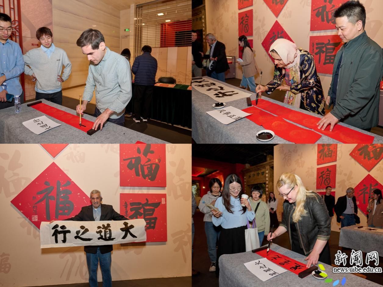 活动期间,外籍教师一行还走进中国共产党历史展览馆与西泠印社联袂推出“印载山河——西泠印社典藏菁华特展”,沉浸式感受中华传统书画艺术的独特魅力。展厅内陈列着书法、国画、篆刻等品类的精品佳作,既有笔墨苍劲的历代名家书法复刻,也有意境悠远的山水、花鸟、人物国画,集中展现了中国书画“诗书画印”一体的东方审美特质。外教们纷纷驻足欣赏,不时询问作品的文化内涵与创作技法。活动末尾,外教们在专业书法老师的指导下亲手体验毛笔书写,完成了“大道之行”“马到成功”等寓意美好的汉字作品,在笔墨间感受中华传统文化的深厚底蕴。