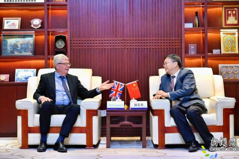 赵忠秀对David Cardwell一行表示热烈欢迎。他介绍,对外经济贸易大学坚持高水平教育对外开放,尤其重视与英国高水平大学及国际组织开展多维度合作。他表示,剑桥大学在人才培养、学术研究等方面积累了丰富经验,值得我校学习借鉴。面向数字智能与人工智能快速发展的新形势,学校高度重视师生人工智能素养培育,希望以此次交流为契机,与剑桥大学在相关领域加强探讨,期待未来双方进一步深化各领域交流与合作。