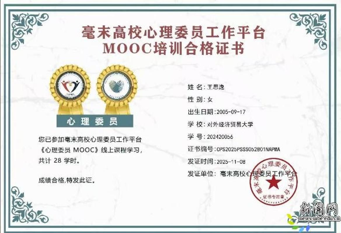 为更好地胜任工作,王思逸主动提升专业能力。她以高分完成心理相关线上课程学习,牵头组织心理委员学习交流活动,和大家一起研读工作手册、分享实践经验;还多次协助老师开展心委培训,在与老师的交流中进一步明确工作方向,让服务更具针对性。