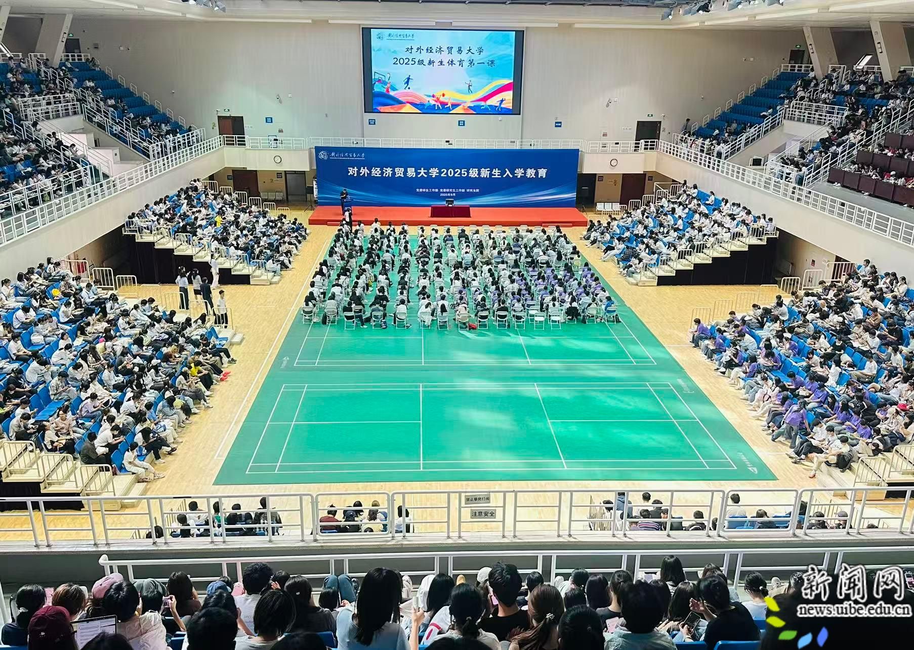 校新闻网讯(体育部供稿)9月29日下午,我校在红天体育馆面向2025级新生,举行对外经济贸易大学体育第一课。本次体育第一课由体育部胡东旭书记主持,体育部副主任(主持工作)李福德和专职教师顾若辰老师(乒乓球世界冠军)依次主讲,主题为“我运动我快乐 我健康我光荣”。体育部全体教职工与2025级新生参会。