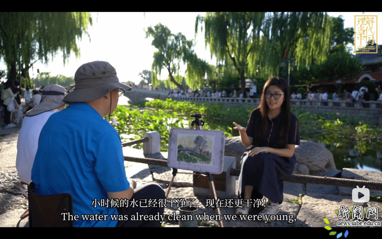 在创作过程中,团队成员以国际传播视角探索如何以影像讲述中国故事,将传统文化意象与现代传播语言有机融合。影片以Cindy(武梓莹)的行走视角为叙事主线,带领观众循着北京中轴线的脉络,探访这座城市由古至今的生活图景。镜头随她穿行于古都秩序与日常烟火之间——从宫阙深处的静谧,到胡同街巷的生动。影片中,Cindy与来自乌兹别克斯坦的留学生Bekzod共同体验“数字中轴”VR项目,并一同品尝中轴线上的传统美食全聚德烤鸭;团队还在万宁桥畔采访了“速写北京”成员,记录他们以画笔描摹城市、以色彩对话生活的瞬间。多元的文化视角与真实的市井图景交织,共同构成“人民创造美”的生动画卷。