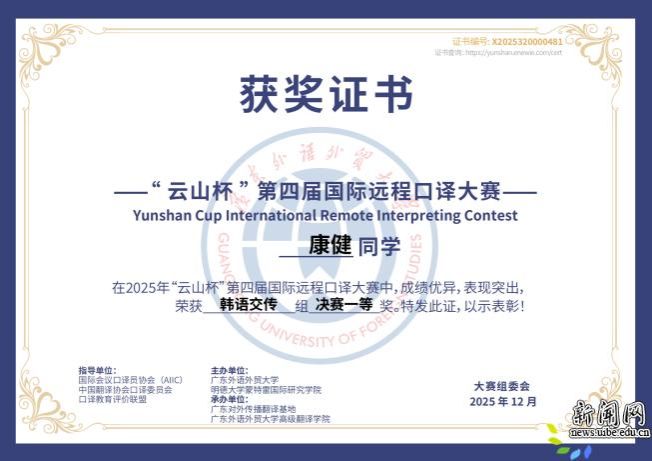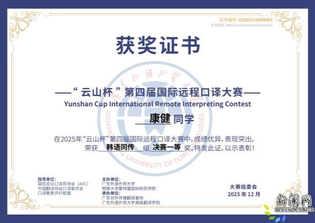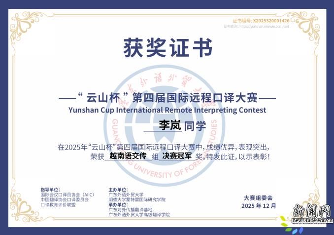 此次比赛在高度仿真的线上环境中考察选手的语言转换、跨文化理解和技术适应能力。外语学院参赛学子沉着应对、精准表达,展现了扎实专业素养和职业潜质。获奖学生表示,成绩的取得离不开学院系统化培养与导师指导。康健同学表示,远程口译已成为行业常态,“云山杯”通过高度仿真的线上竞赛环境,对选手在语言转换、输出稳定性与技术适应等方面提出了综合考验。比赛不仅检验了其专业训练成效,也让她在观摩海内外优秀选手表现后进一步明确了自身的提升方向。李岚同学认为,此次夺冠既是对学院培养和自身阶段性学习成果的肯定,也激励她以更高标准持续打磨口译能力。(撰稿:李岚 康健 审稿:田文泉)