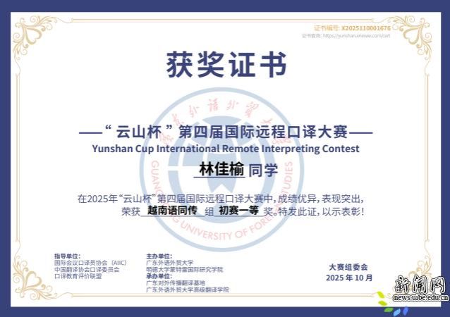 校新闻网讯(外语学院供稿)12月20日,第四届“云山杯”国际远程口译大赛总决赛在广东外语外贸大学圆满落幕。外语学院学子凭借扎实的专业功底和稳定的临场发挥,在多个语种赛道中取得优异成绩,展现了贸大外语学院的专业实力与国际视野。