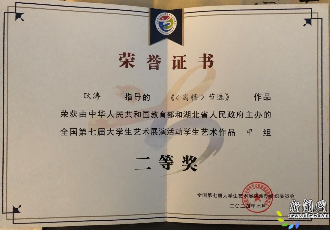 校新闻网讯(文学与国际传播学院供稿)近日,教育部办公厅公布全国第七届大学生艺术展演活动评选结果,由文学与国际传播学院耿涛老师指导的学生书法作品荣膺艺术作品类全国二等奖。这一成绩是我校在该项赛事中的历史最好成绩,填补学校二十年来在这一全国顶级学生艺术赛事中的获奖空白。