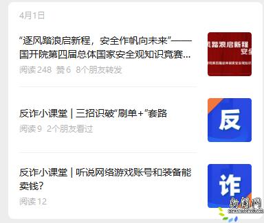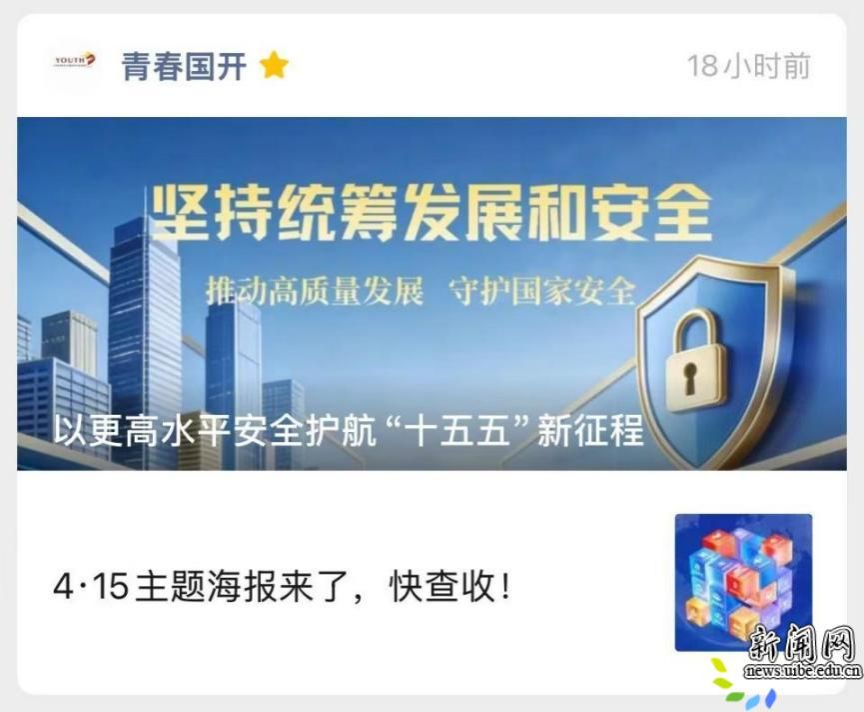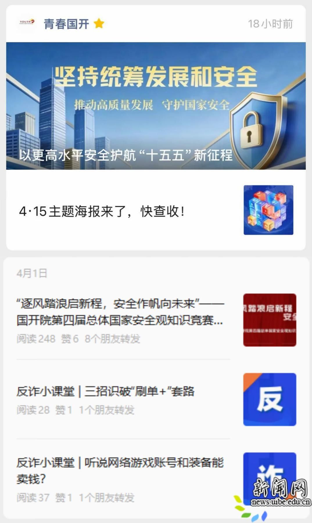 利用“青春国开”微信公众号在安全教育月期间,持续转发、解读多篇“4·15”全民国家安全教育日主题推送及反诈防骗权威资讯。通过线上线下的同频共振,将国家安全、财产安全、网络安全等知识精准送达每位师生指尖,于日常渗透中营造了“国家安全,人人有责;防诈反骗,人人参与”的浓厚校园文化氛围。