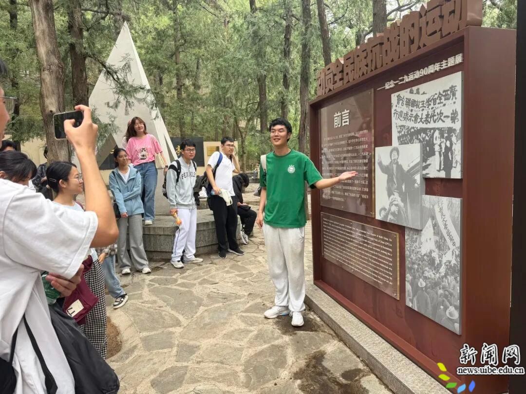 一二・九纪念亭庄严肃穆,亭旁四块主题展板完整呈现一二・九运动的历史脉络。本次活动以展板为课堂,由入党积极分子戚弘毅、金雨航、王怡诺和优秀团员沈雨田四名同学担任宣讲人,分别围绕运动背景、请愿历程、各界支援及精神传承展开现场讲解。