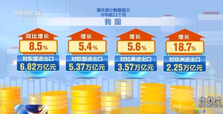 海关总署近日公布的数据显示,今年前11个月,我国货物贸易保持增长,进出口总值41.21万亿元,同比增长3.6 %。对外经济贸易大学教授屠新泉在接受央视总台环球资讯记者采访时表示,如今中国外贸产品结构逐步升级,新兴市场多点开花,中国外贸发展为世界经济发展作出重要贡献。