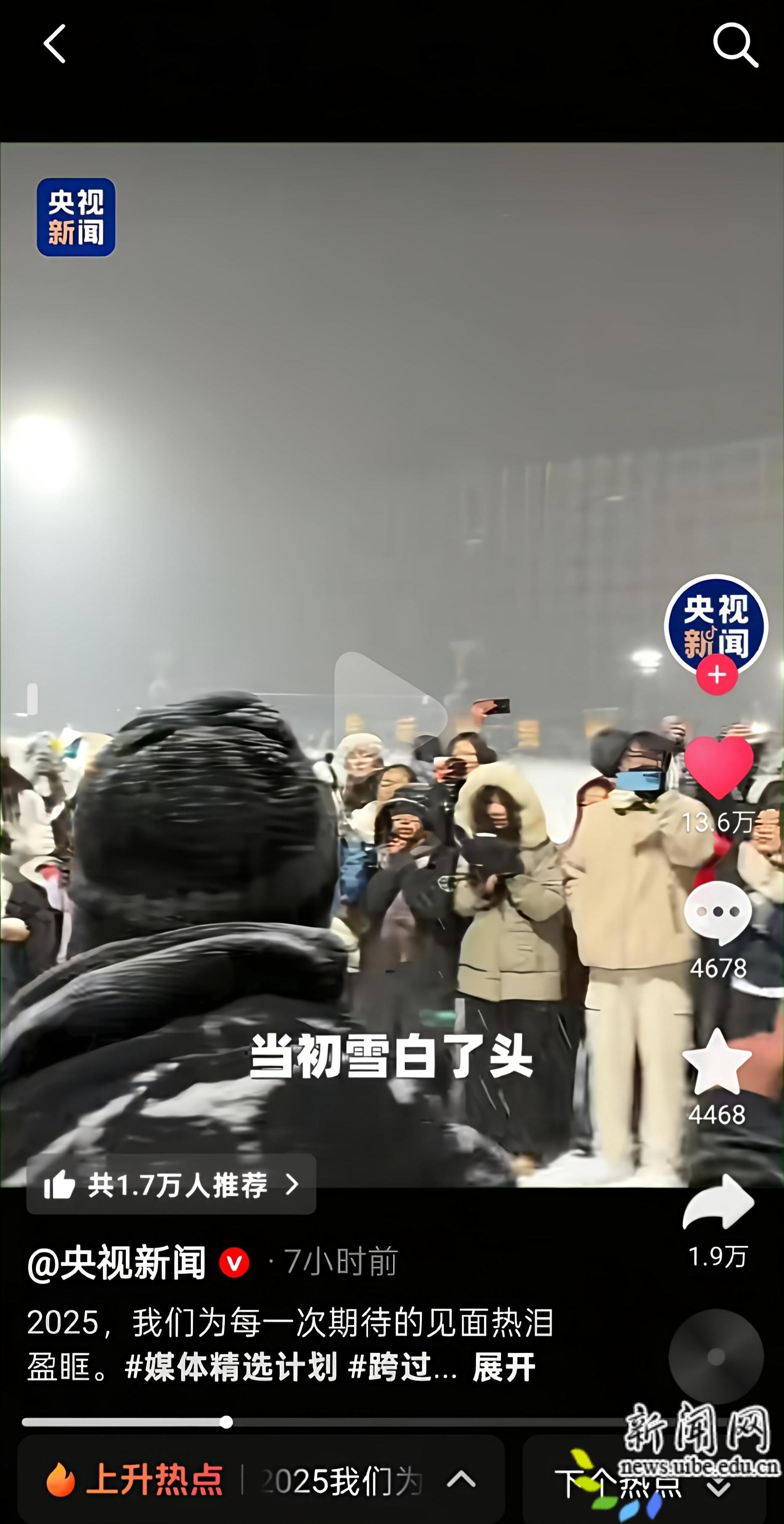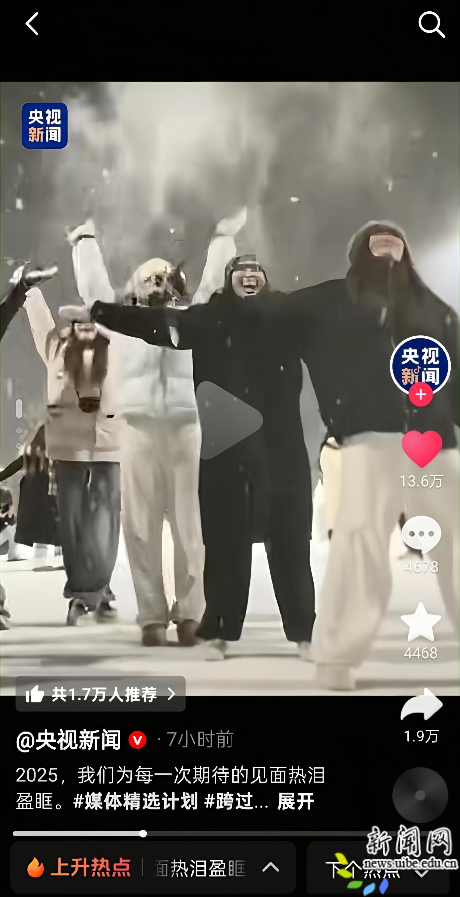 校新闻网讯(党委宣传部供稿)12月24日,央视新闻发布《2025,我们为每一次期待的见面热泪盈眶》主题视频,视频片段中出现贸大学子雪中放歌、雪中起舞的温馨画面,镜头定格下青春与冰雪交融的美好瞬间,并搭配专属旁白,传递出温暖治愈的新年期许。
