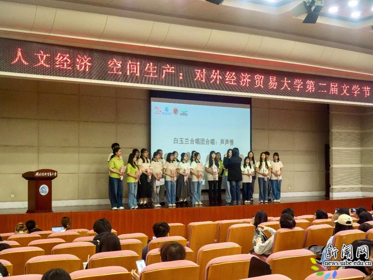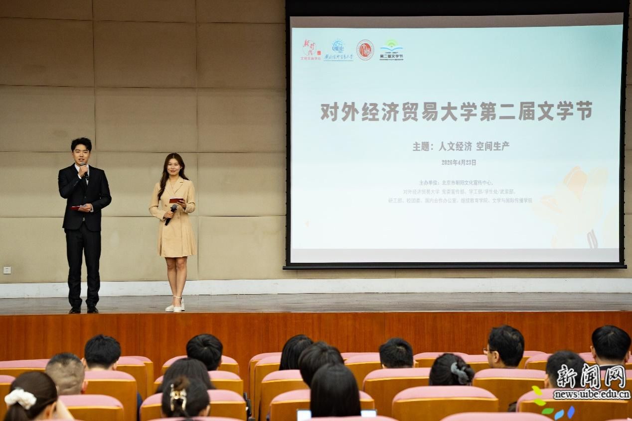 2026年4月23日,对外经济贸易大学第二届文学节开幕式在宁远楼三层国际报告厅举行。本次活动由北京市朝阳文化宣传中心,对外经济贸易大学校党联合主办,以“人文经济 空间生产”为主题,汇聚校内外专家学者、文化嘉宾、优秀校友及师生代表200多人,共话文学与城市、文学与记忆、文学与青春的时代话题。