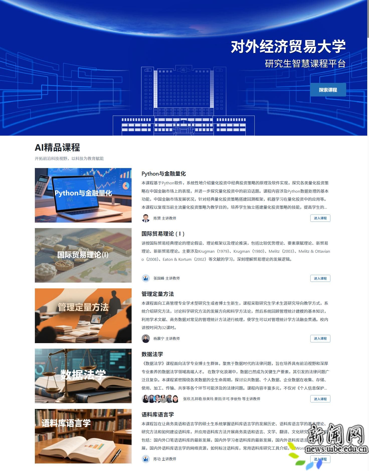 深化技术赋能,全面推进数智化教学模式创新。建设高质量智慧课程平台,首批建成5门精品示范课程,依托教学改革项目支持推进30门智慧课程开发。面向全校研究生教师提供数智化教学技术工具支持,配套组织专题培训,全面提升教师数智化教学能力。分赛道推进人工智能“五助”应用场景落地,建设数智化教学改革项目100余项。总结“人工智能+”新文科研究生教育体系创新发展先进经验,《“人工智能+X”研究生公共必修课:培养具备人工智能素养的新文科财经人才》获批北京市教育教学改革示范案例。
