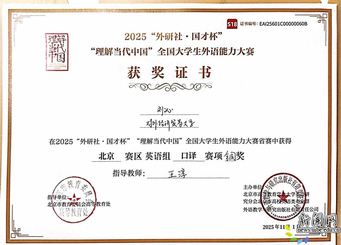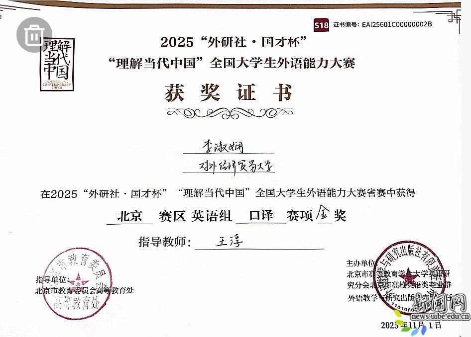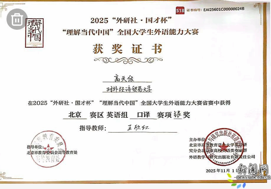 校新闻网讯(英语学院供稿)11月1日,2025“外研社·国才杯”“理解当代中国”全国大学生外语能力大赛英语口译赛项北京地区比赛在北京外国语大学高级翻译学院举行。英语学院2024级口译专业学生李淑娴、刘沁,2025级口译专业学生高天佐代表我校参赛,与来自北京多所高校的80余名选手同台竞技。