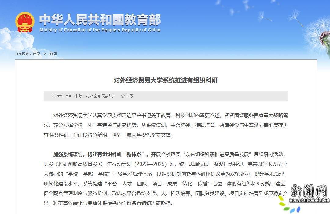 编者按:12月19日,教育部网站首页“战线联播”专栏以《对外经济贸易大学系统推进有组织科研》为题,报道我校充分发挥学校“外”字特色与研究优势,多维度推进有组织科研的典型做法。全文如下: