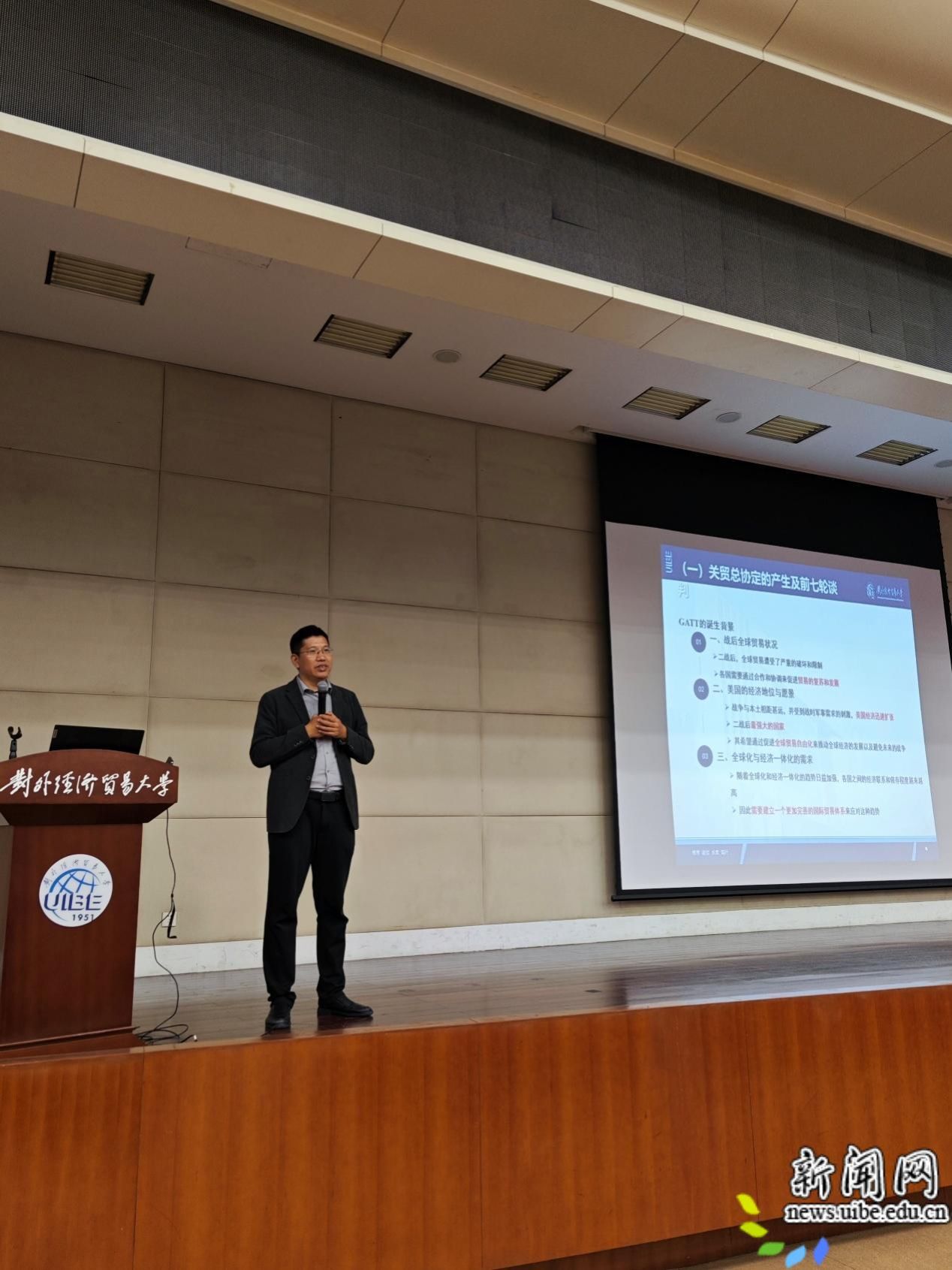 刘斌从核心概念切入,指出全球经济治理体系涵盖气候、发展、安全等多领域治理,并系统阐述了中国提出各大全球倡议。他以战后布雷顿森林体系为起点,详解了世界银行、国际货币基金组织、关贸总协定构成的战后经济支柱,梳理了从美元霸权主导到G20机制化、新兴力量崛起的治理转型脉络。他从我校人才培养的实际出发,总结了全球经济治理在人才方面的迫切需求,勉励同学们抓住时代机遇,努力成长成才,厚植家国情怀,在深化全球经济治理进程中贡献当代中国青年的智慧和力量。