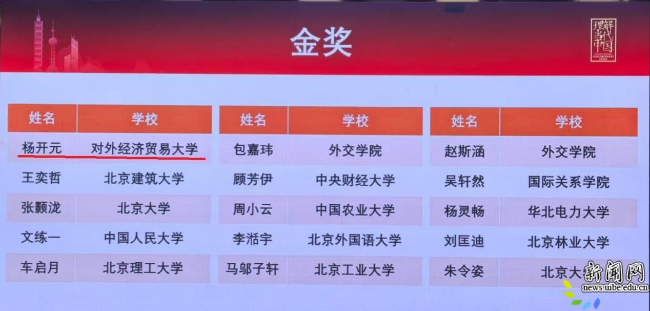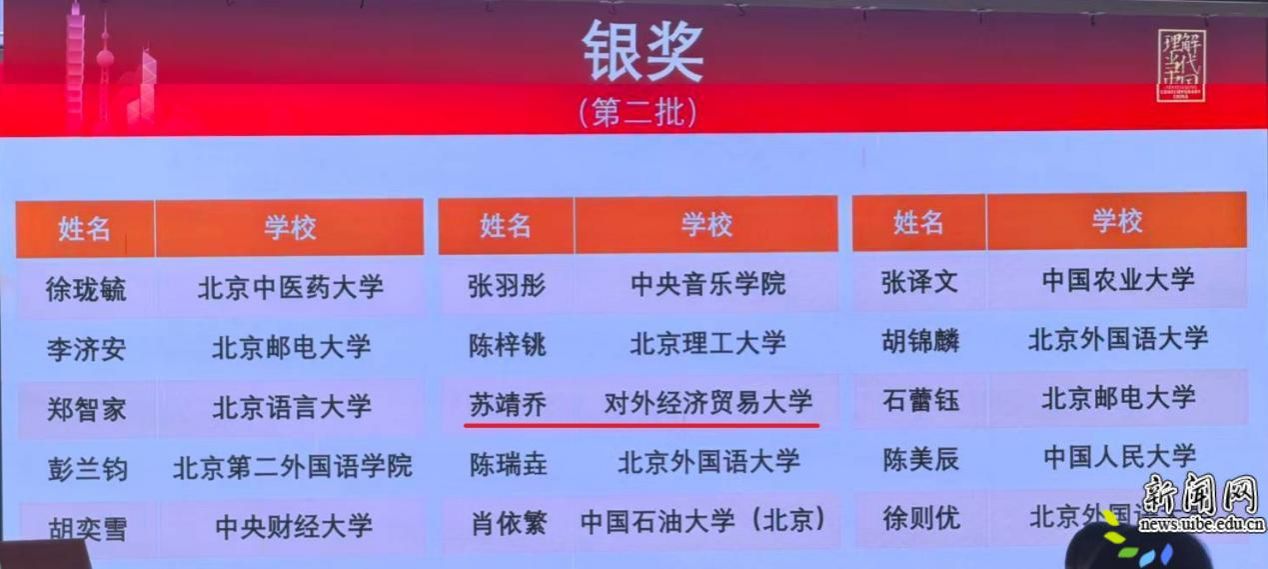 校新闻网讯(英语学院供稿)近日,2025“外研社·国才杯”“理解当代中国”全国大学生外语能力大赛北京赛区英语组演讲比赛圆满落幕。经过激烈角逐,我校参赛学子表现卓越,脱颖而出。其中,由英语学院李玉霞老师指导的中国金融学院2025级杨开元同学勇夺金奖,并成功晋级全国决赛;由英语学院张冬冰老师指导的英语学院2023级苏靖乔同学荣获银奖。两位同学的优异表现为学校赢得了荣誉,充分展现了我校学子的卓越风采与深厚的外语综合应用能力。