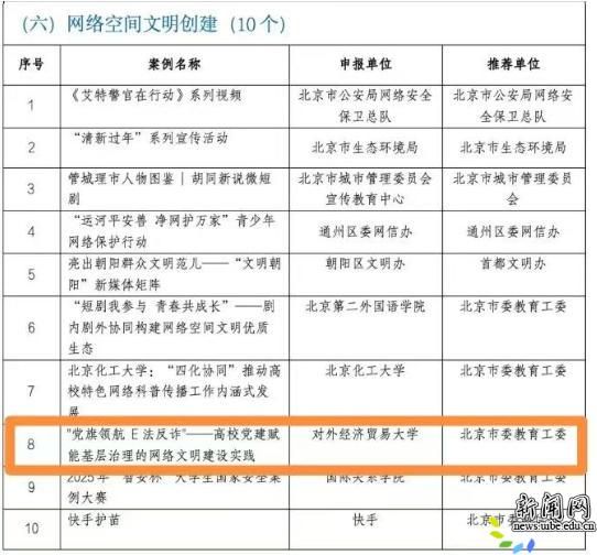 校新闻网讯(法学院供稿)近日,由北京市委网信办、首都文明办联合组织开展的2025年北京市网络文明建设优秀案例评选结果正式揭晓,由我校党委宣传部组织报送的法学院《“党旗领航 E法反诈”——高校党建赋能基层治理的网络文明实践》项目成功入选,荣获优秀案例奖。该评选聚焦网络空间思想引领、文化培育等六大方向,经多轮评审从全市申报案例中遴选出50个具有代表性、创新性和示范性的优秀项目,我校获奖项目是高校党建赋能网络文明建设的典型代表。