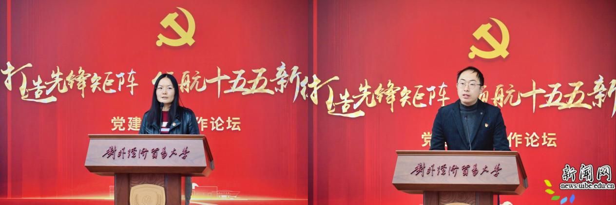 北京高校党建工作“标杆院系”、“样板支部”培育创建单位代表进行主题发言。马克思主义学院党总支孙晓霞介绍了学院党总支构建“制度健全、运行高效”的党建引领共同体、“政治过硬、本领高强”的师资发展共同体、“内涵深厚、特色鲜明”的立德树人共同体、“开放协同、知行互促”的协同育人共同体的党建工作格局。人工智能与数据科学学院学生一支部黄伟钊介绍了以“三性三力三度”筑基,打造集“学习型、技术型、服务型、科创型”于一体的学生党支部的建设思路。文学与国际传播学院研究生第一党支部安韩梅介绍了支部构建“四个同向、四个共进”的工作体系、建立“三二一”学习教育体系、培养“兼具国际视野与经贸特色的红芯文传人”的经验和做法。