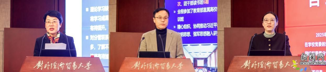 黄宝印从七个方面概括学校党委领导班子2025年的工作。一是以政治建设为统领,加强党对学校工作的全面领导,深入学习宣传贯彻党的二十届四中全会精神,开展深入贯彻中央八项规定精神学习教育,健全党的全面领导工作机制,高质量总结“十四五”,高水平谋划“十五五”,坚持为师生办实事解难题;二是以组织建设为基石,夯实组织保障和干部人才支撑,严格落实党建和思想政治工作标准,提升党建工作制度化规范化科学化水平,13个党组织入选全国和北京市党建工作标杆院系、样板支部,打造堪当时代重任的高素质干部队伍,拓展引才渠道,持续加强海外引才工作;三是以立德树人为根本,培养堪当民族复兴重任的时代新人,抓牢课堂教学“主渠道”,健全思想政治工作体系,拓展实践和网络育人空间阵地,以教育家精神铸魂强师,深化教师评价改革,涌现“全国高校黄大年式教师团队”等先进典型;四是以改革创新为动力,深入推进新一轮“双一流”建设,优化学科学位点布局,组建经济学院、文学与国际传播学院、人工智能与数据科学学院,系统推进有组织科研,国家安全计算实验室入选教育部第二批哲学社会科学实验室,自主构建的全球经济智思体入选教育部首批教育专用大模型,拓展拔尖创新人才培养新模式,实施招生就业“守盘护牌”行动;五是以“外”字文章为特色,积极服务高水平教育对外开放,坚持和加强党对外事工作的全面统一领导,全力推动实施“五百”计划,推动留学生教育提质增效,做强“留学贸大”品牌;六是以服务国家为己任,为国家和区域发展贡献贸大智慧,服务国家经济主战场、区域发展战略,聚焦中美贸易摩擦及应对、自贸试验区提升等重点领域开展集中攻关,组织学者针对贸易、关税风暴在主流媒体发声,提高社会服务水平,国内合作、乡村振兴、校友工作取得新成效;七是以从严治党为保障,营造风清气正的政治生态和育人环境,扛起全面从严治党政治责任,加强各类监督贯通协调,维护意识形态和校园安全稳定,一体推进党风政风师德师风校风学风建设。