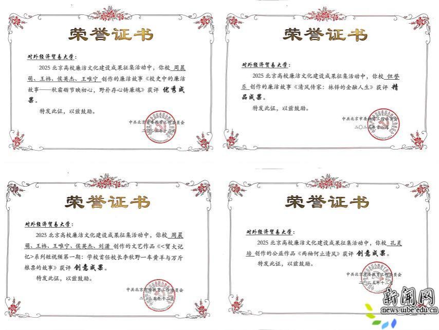 校新闻网讯(党委宣传部稿)近日,北京市学校思想政治工作中心公布了2025北京高校廉洁文化建设成果征集结果,我校4件作品分别入选廉洁故事精品成果、廉洁故事优秀成果、文艺作品创意成果和公益作品创意成果。
