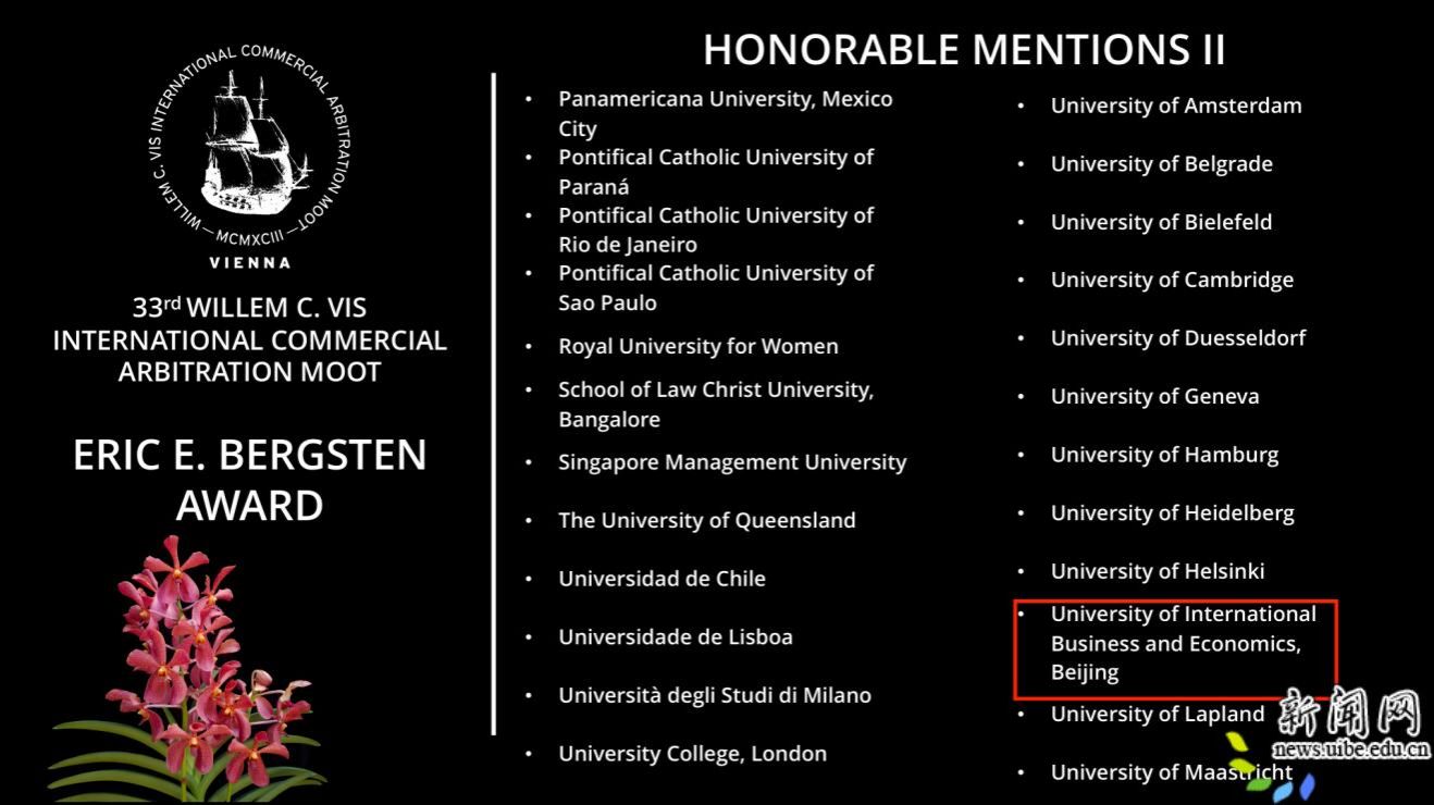 校新闻网讯(法学院供稿)近日,全球规模最大、历史最悠久的国际商事模拟仲裁庭赛事——“Willem C. Vis Moot国际商事模拟仲裁庭竞赛”(“Vis Moot”)落下帷幕。对外经济贸易大学代表队(“贸大代表队”)表现亮眼,在最富盛名的“Vis维也纳赛”中跻身全球64强,是本届唯一晋级的中国内地高校赛队。