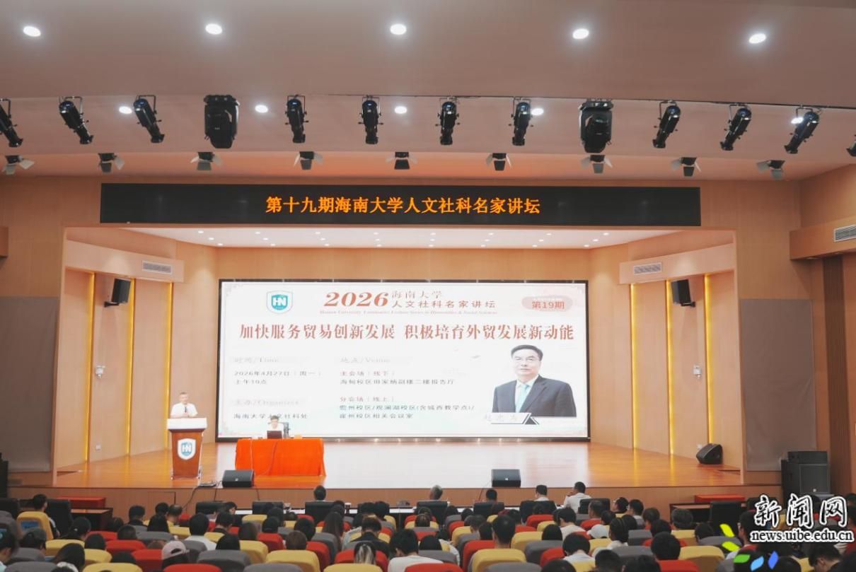 校新闻网讯(党委办公室/校长办公室供稿)4月27日,校长赵忠秀赴海南自贸港开展专题调研,通过学术报告与实地对接相结合的方式,为自贸港高水平开放贡献贸大智慧。当日上午,赵忠秀应邀做客海南大学第十九期人文社科名家讲坛,作题为《加快服务贸易创新发展 积极培育外贸发展新动能》的学术报告。海南大学党委书记李湖等校领导出席讲坛。