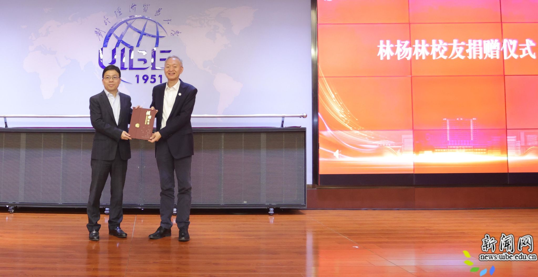 大会举行“新里程卓越人才培养基金”捐赠仪式。副校长王强代表学校接受捐赠,并向对外经济贸易大学校友、新里程健康产业集团有限公司董事长林杨林颁发捐赠证书。