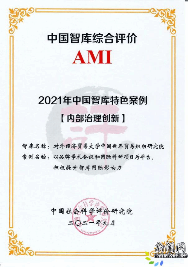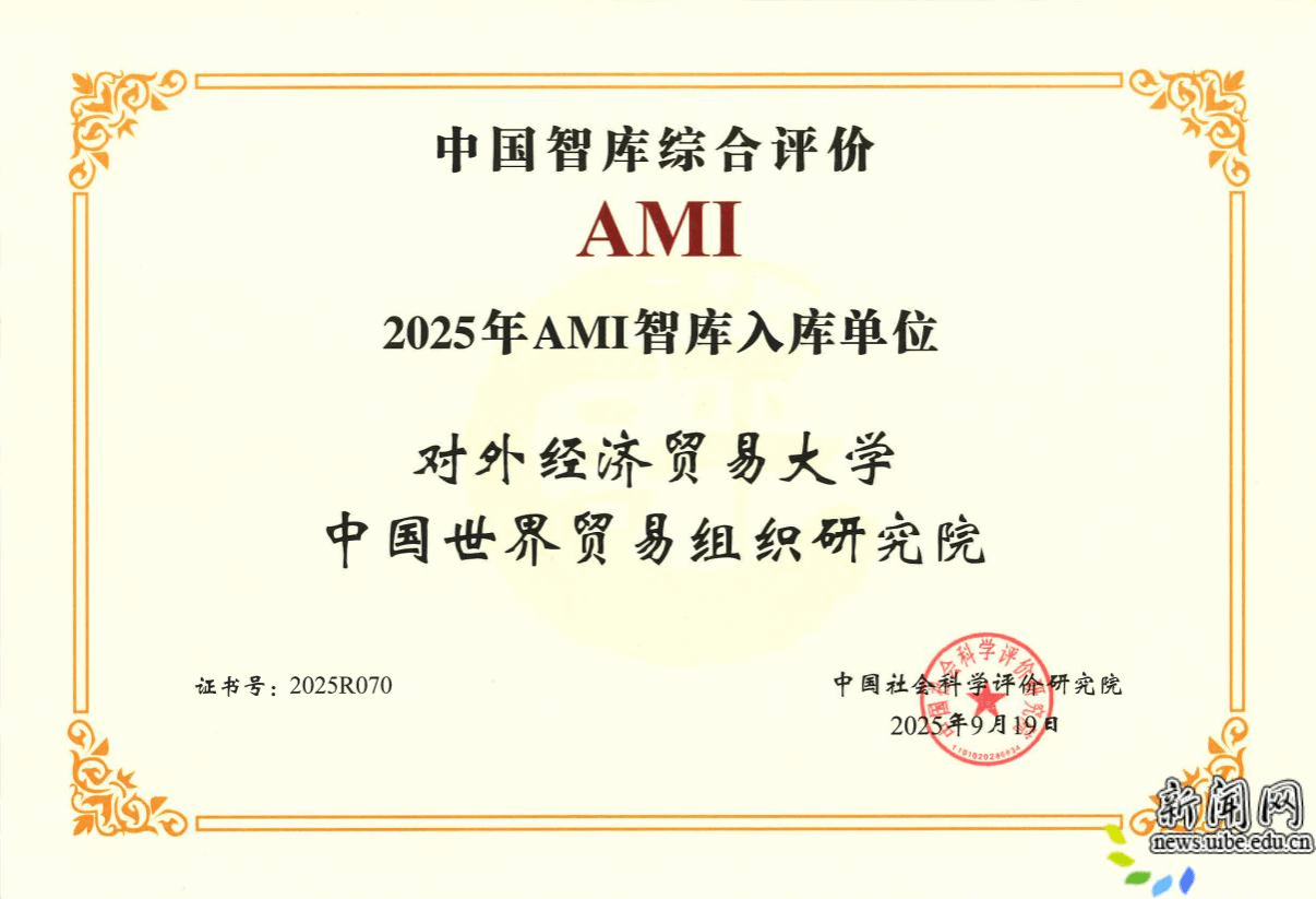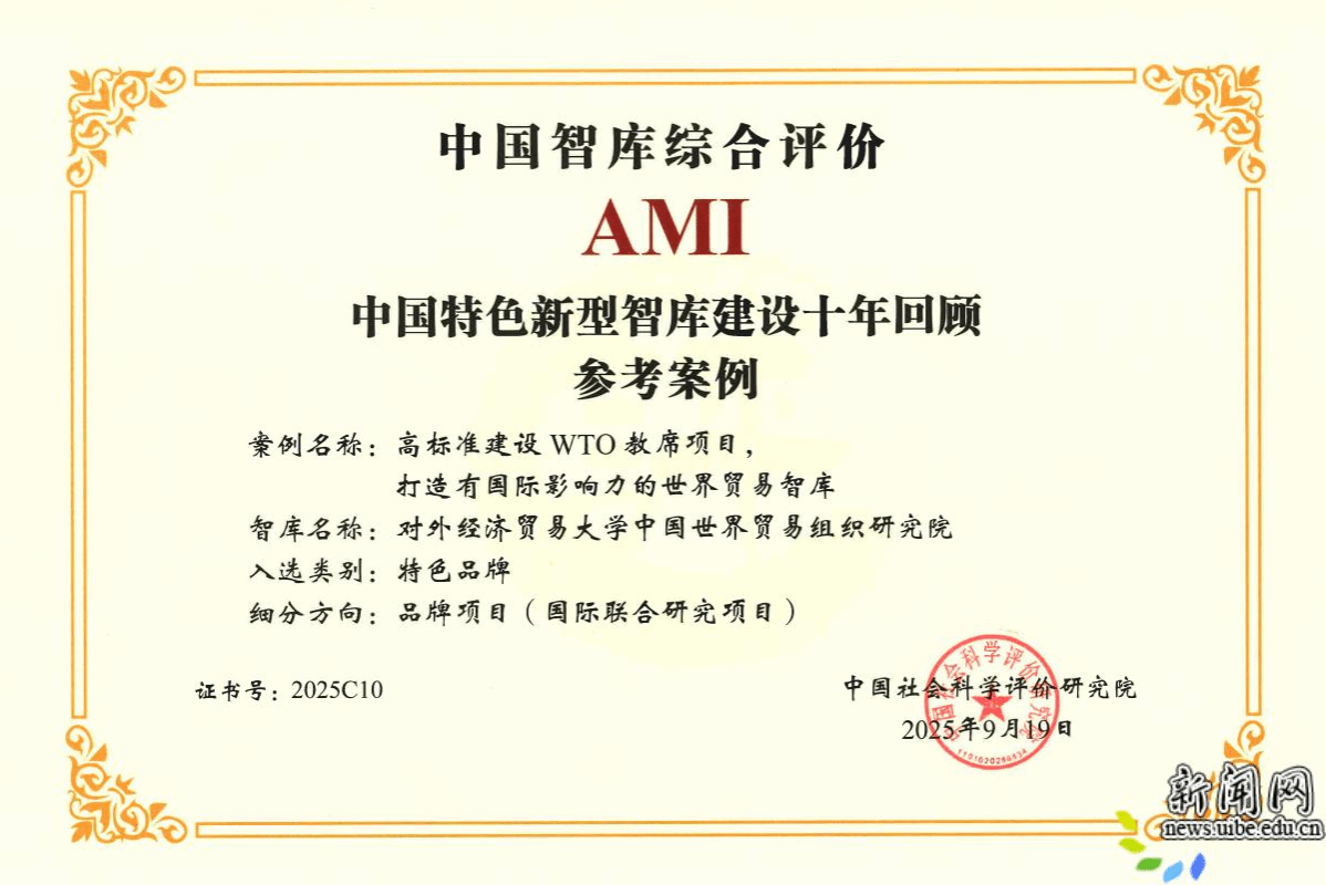 校新闻网讯(中国世界贸易组织研究院 供稿)2025年9月19日,由中国社会科学院中国社会科学评价研究院主办的第八届中国智库建设与评价高峰论坛在京举行。来自全国多个省市的智库主管方、建设方代表以及相关专家学者参会,围绕智库特色品牌建设及实践经验展开专题研讨。会上颁发了中国智库综合评价2025年AMI智库入库单位等证书。我院成功入选中国智库综合评价2025年AMI智库名单,申报的特色品牌案例“高标准建设WTO教席项目,打造有国际影响力的世界贸易智库”入选中国特色新型智库建设十周年回顾参考案例。