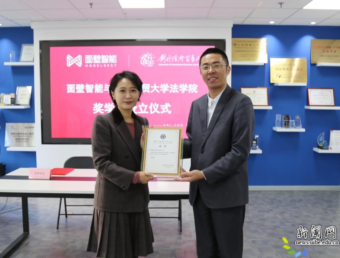 冯辉代表法学院向面壁智能颁发“面壁智能·AI与法律”奖学金设立证书,并签署科研合作项目协议书。
