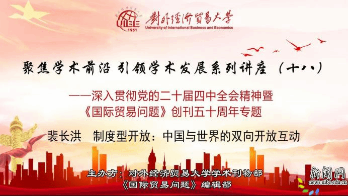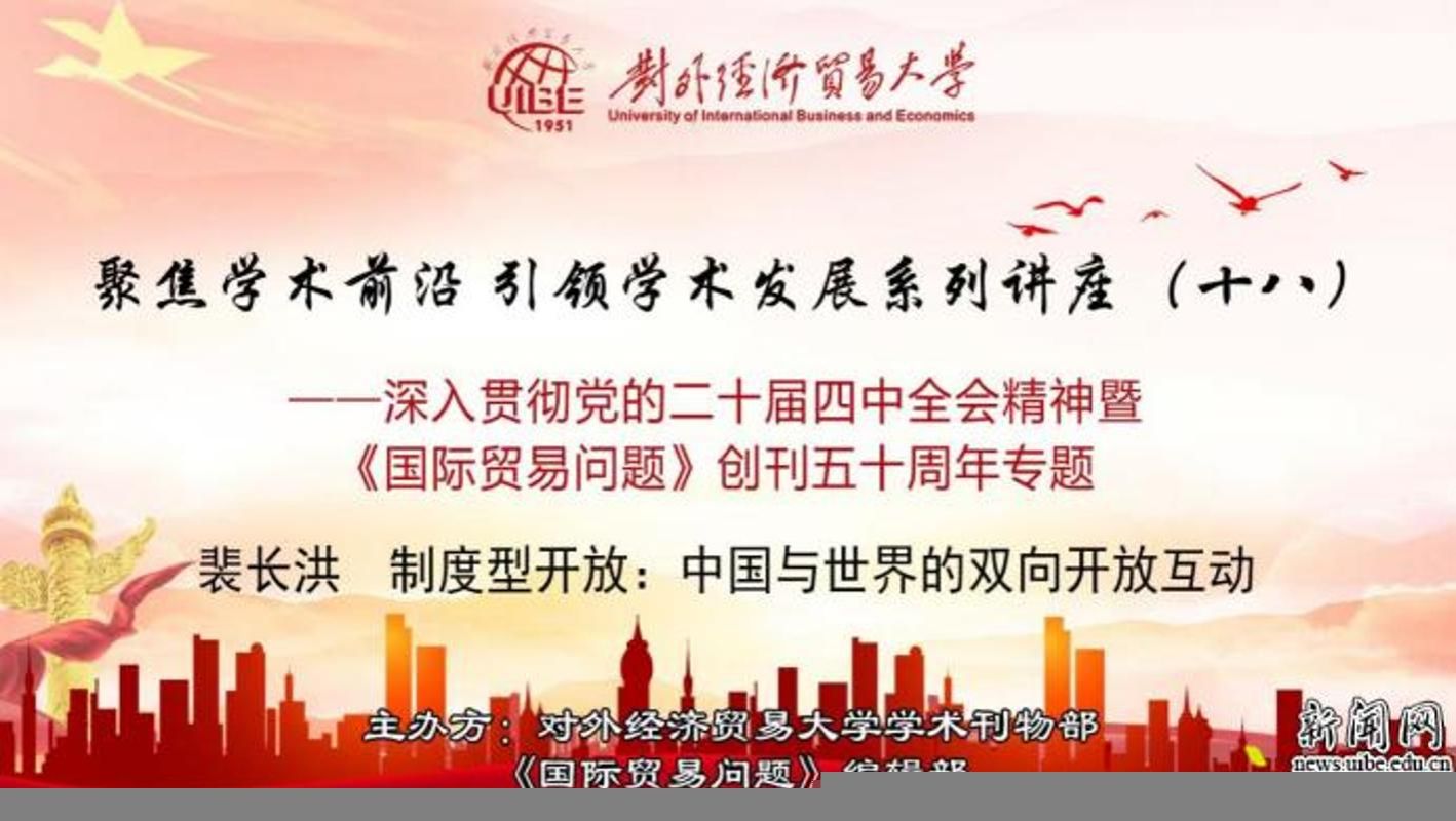 校新闻网讯(学术刊物部供稿)为深入学习贯彻党的二十届四中全会精神,学术刊物部举办系列讲座,推进学科发展和学术交流,为期刊发展注入新动能。12月4日,第六场《国际贸易问题》创刊五十周年专题讲座“制度型开放:中国与世界的双向开放互动”顺利举办。讲座由中国社会科学院经济研究所原所长、对外经济贸易大学红天讲席教授裴长洪主讲,学术刊物部华迎主任主持。线上讲座通过腾讯会议、贸大微信视频号同步直播,各平台参会人数达1600余人,受到了参会学者的一致好评。