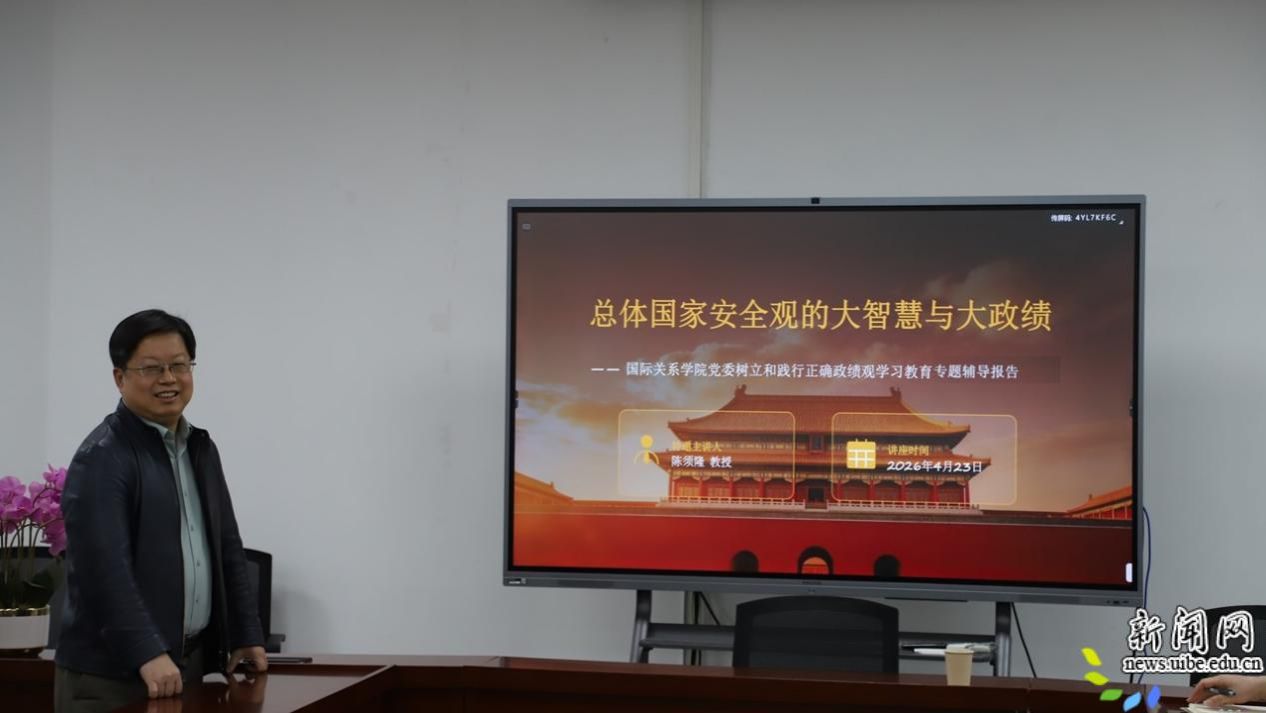 校新闻网讯(国际关系学院供稿)4月23日,国际关系学院党委在诚信楼229会议室开展树立和践行正确政绩观学习教育第三期读书班学习,特邀学院陈须隆做主题为“总体国家安全观的大智慧与大政绩”的专题辅导报告,学院全体领导班子成员、党委委员、各学系支部书记共同参加,共同深化理论学习、凝聚思想共识。